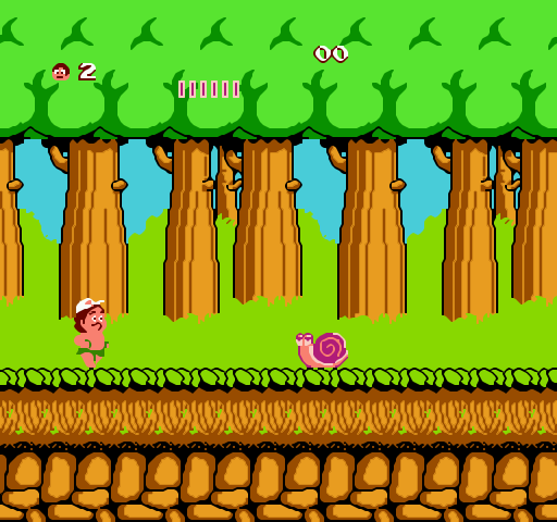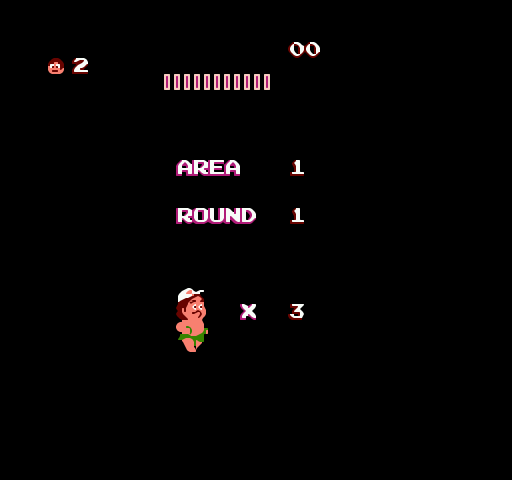 You are cast as Master Higgins, a bouncy and nimblefooted hero who ventures out to the balmy South Pacific to save the beautiful Princess Leilani from the clutches of the evil Witch Doctor. While hopping from island to island and cloud to cloud, you must survive against a barrage of attacks from giant snails, leaping octopuses and swordfish. As you hurl axes at the advancing sea creatures, you can boost your energy by plucking tropical fruits, like bananas and pineapples, from the air. As you reach the caverns, you are greeted by pesky bats, cobras, skullheads, and falling icicles. Once you get to the forest, beware the spiders, sly foxes, and frogs.Adventure Island consists of eight grueling areas with four action-packed rounds in each area. At the end of each area is a boss whom you must defeat to proceed on your quest. But Higgins is continually losing energy as the game progresses and you must pick up fruit or milk to regain stamina.
